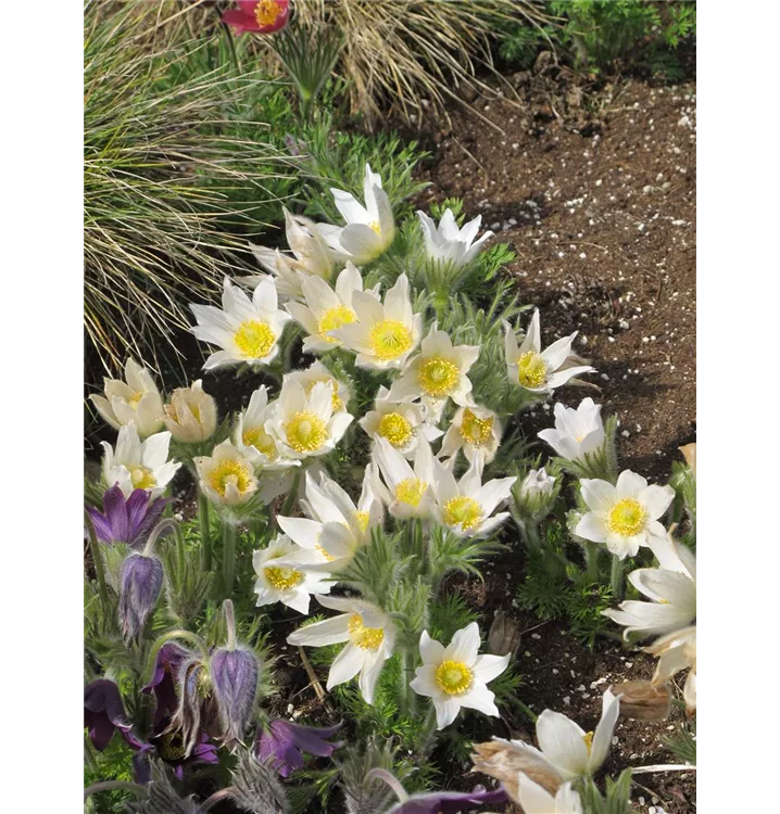 Die Küchenschelle setzt schöne Akzente mit Pflanzen wie: Blaukissen, Moos- Steinbrech, Polster- Flammenblume, niedrige Fetthenne, kompakte Kiefer.