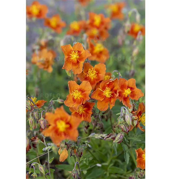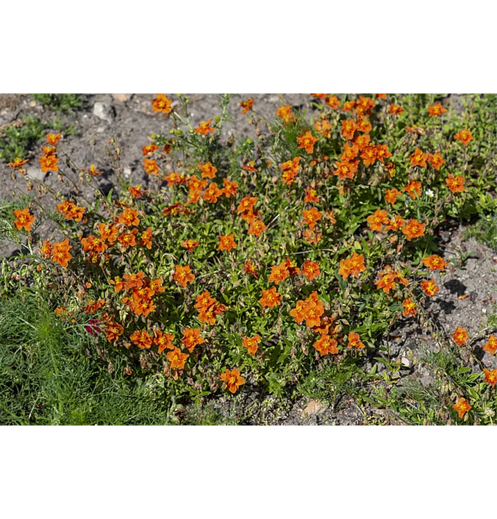 Das orangene Sonnenröschen setzt schöne Akzente mit Pflanzen wie: Schleifenblumen, niedrige Flammenblumen, kriechender Ehrenpreis, niedrige Sommeraster, dunkellaubiger Storchschnabel.