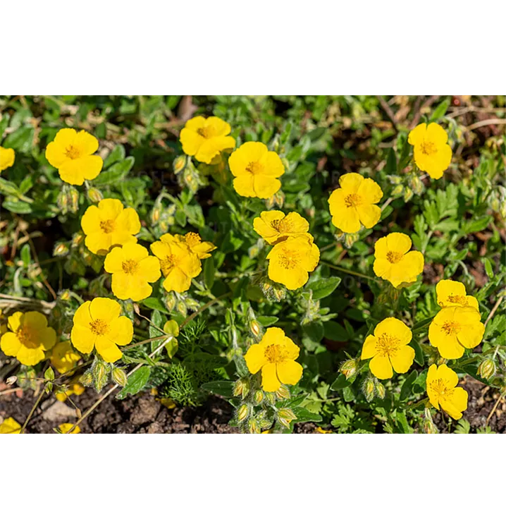 Das gelbe Sonnenröschen setzt schöne Akzente mit Pflanzen wie: Schleifenblumen, niedrige Flammenblumen, kriechender Ehrenpreis, niedrige Sommeraster, dunkellaubiger Storchschnabel, Bergenien.