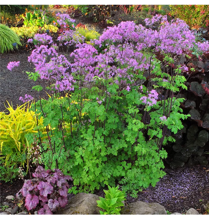 Die Wiesenraute 'Black Stockings' setzt schöne Akzente mit Pflanzen wie: Wiesen-Taglilie, Jakobsleiter, hoher Frauenmantel, Kerzen- Knöterich, kompakter Sommerflieder, Blut- Weiderich.
