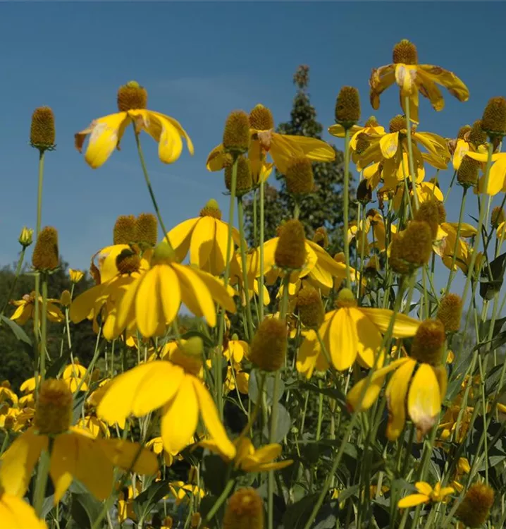 Der hohe Sonnenhut setzt schöne Akzente mit Pflanzen wie: Pfingstrosen, hohe Flammenblume, Indianernessel, Sonnenbraut, Rittersporn, Forsythien, Rispen- Hortensien