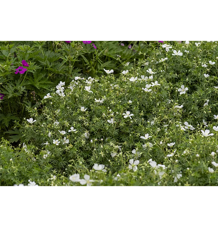 Der Blut- Storchschnabel 'Alba' setzt schöne Akzente mit Pflanzen wie: Purpurglöckchen, Kaukasus- Vergißmeinnicht, Waldsteinia, Zierapfel, winterharte Fuchsie.
