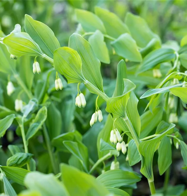 Das vielblütige Salomonssiegel setzt schöne Akzente gemeinsam mit: Funkie, Braunstieliger Streifenfarn, Wurmfarn, Schnee-Hainsimse, Tränendes Herz, Fingerhut, Rhododendron, Spierstrauch, Japan- Segge.