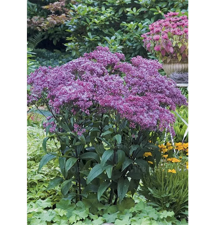 Der Wasserdost 'Baby Joe' setzt schöne Akzente mit Pflanzen wie: Blut- Weiderich, Taglilien, hoher Frauenmantel, Chinaschilf