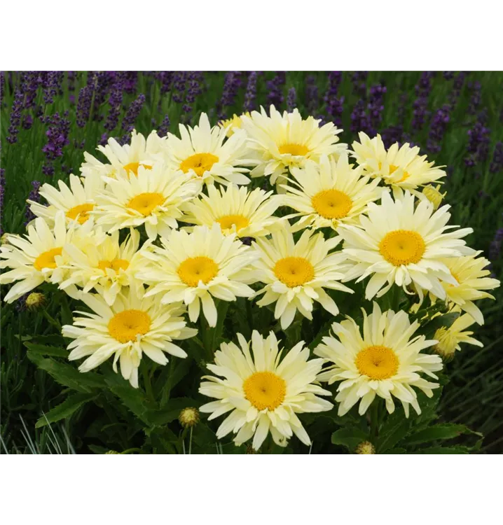 Die Sommer- Margerite setzt schöne Akzente mit Pflanzen wie: Lupinen, Sonnenbraut, Pfingstrosen, Sonnenhut, Jakobsleiter, kompakter Sommerflieder, Rittersporn.