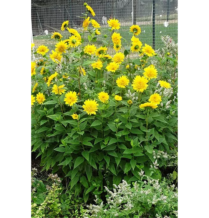 Die mehrjährige Sonnenblume setzt schöne Akzente mit Pflanze wie: Rittersporn, hohe Flammenblume, kompakter Sommerflieder, Strauchrosen, Flieder, Rutenhirse, Reitgras, Chinaschilf, hoher Steppen- Salbei.