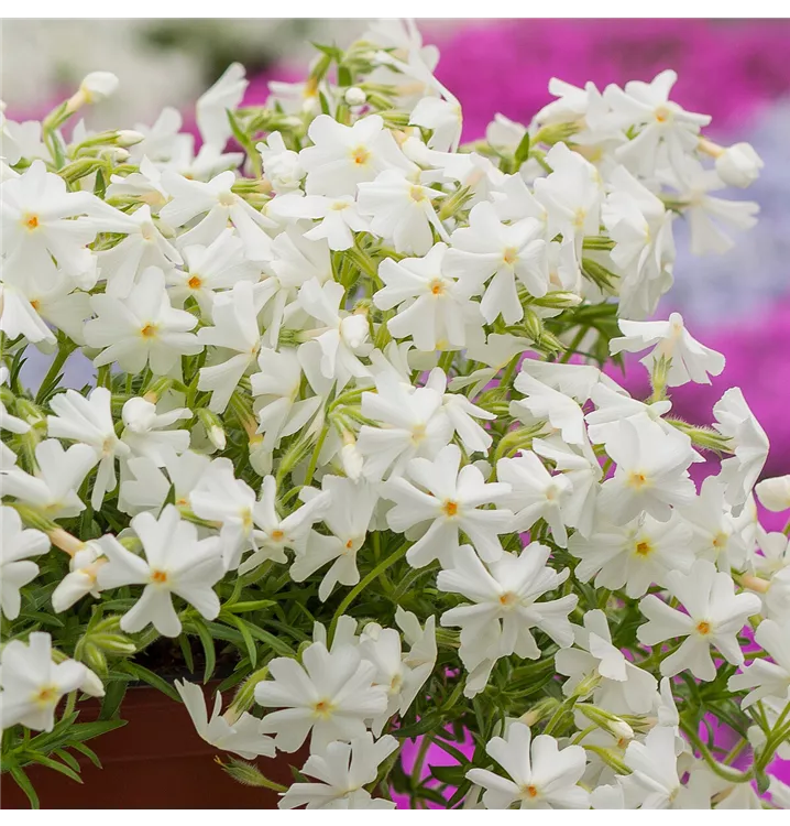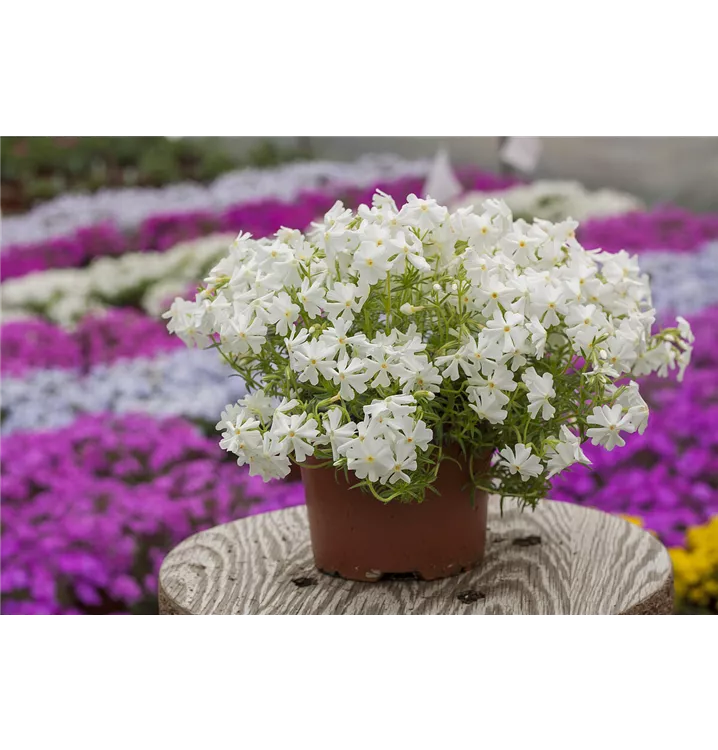 Die Teppich- Flammenblume setzt schöne Akzente mit Pflanzen wie: Schleifenblume, Kaukasische Gänsekresse, Sonnenröschen, Blauraute, Blauraute, Lavendelheide, niedriger Ehrenpreis, kriechender Thymian, Blaukissen