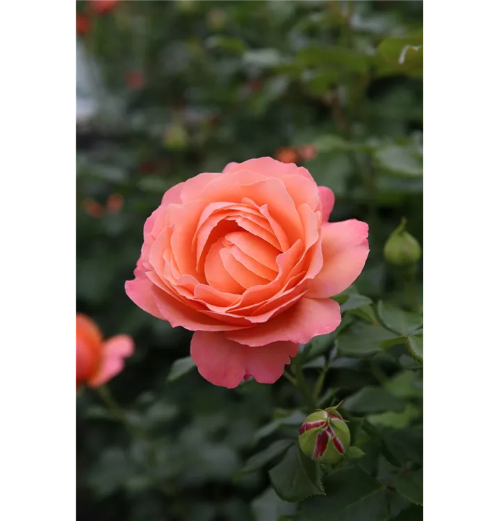 Blüte: öfterblühend, apricot-lachsorange, gut gefüllt, rundliche Form