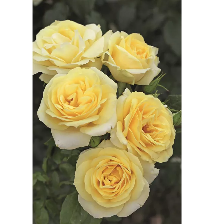 Blüte: öfterblühend, hellgelb, stark gefüllt, blüht in kleinen Dolden, leichter Duft