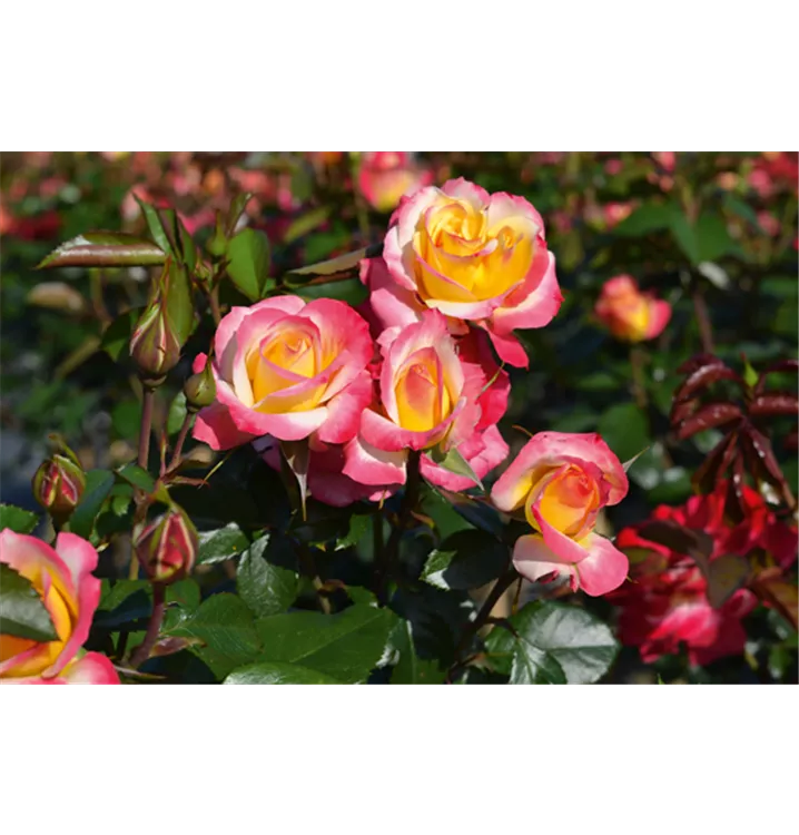 Blüte: öfterblühend, leuchtend gelb mit pinkfarbenem Rand, gefüllt, leichter Duft
