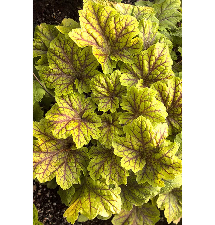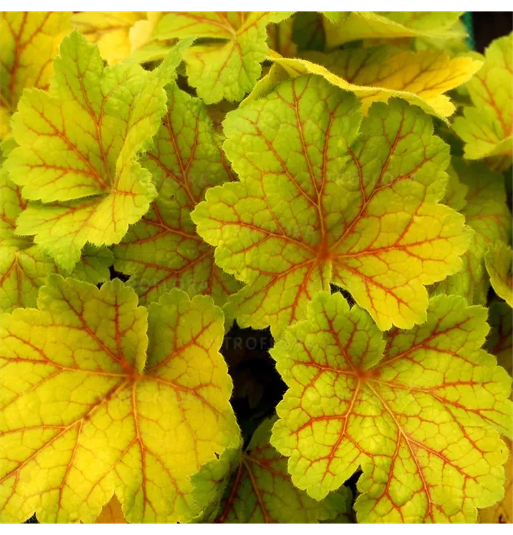 grüngelbes Laub, zarte rotbraune Zeichnung, herzförmig, gefiedert, gezähnt