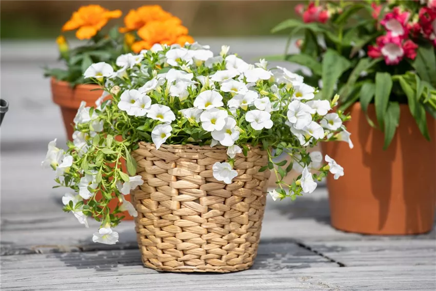 Calibrachoa, weiß Im Fachhandel werden Pflanzgefäße aus unterschiedlichen Materialien angeboten. Die Auswahl fällt oft schwer.