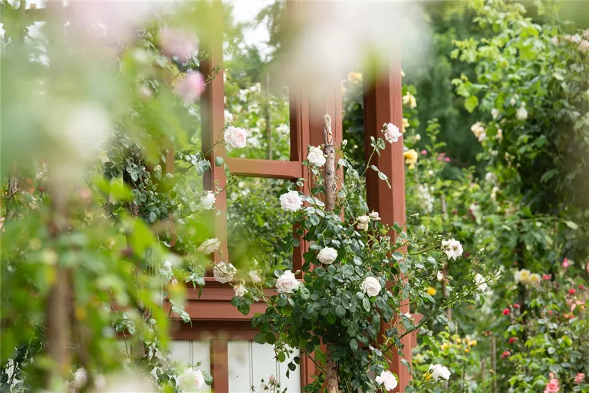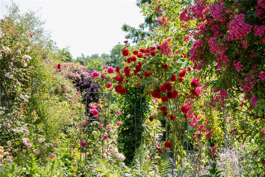 Wenn ein Pavillon oder ein Sichtschutz im Rosengarten begrünt werden soll, sind Kletterrosen die richtige Wahl. Diese Rosen entwickeln sich dicht und hoch, so dass sie sich optimal dazu eignen, an baulichen Elementen zu wachsen. Moderne Züchtungen der Kletterrose blühen nicht nur im Juni, sondern erfreuen zusätzlich mit einer weiteren lange andauernden Blüte. Außerdem gibt es Sorten, die nicht nur durch ihre üppigen Blüten erfreuen, sondern zusätzlich mit einem angenehmen Duft. Im naturnahen Rosengarten wird häufig die Kletterrose mit der Clematis kombiniert, um zum Beispiel einen Zaun zu begrünen. Aber auch für Laubengänge sind Kletterrosen ideal und somit ein wichtiges gestalterisches Element in der Planung eines Rosengartens. Rambler können ebenfalls Mauern begrünen und gehören vor allem in einen natürlichen Rosengarten.